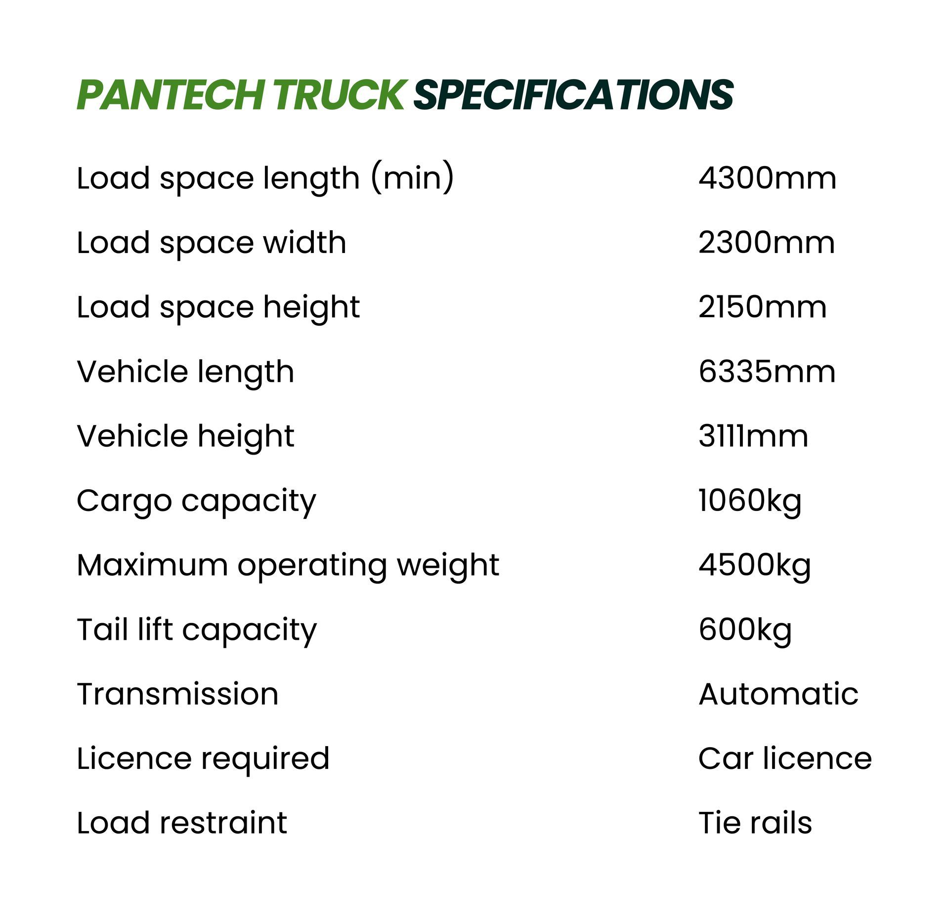 This automatic pantech truck provides a secure, weather-protected 19m³ load space for transporting bulky items. With tie rails inside the body, you can strap loads safely in place, and the 600kg tail lift helps when moving heavier items that are awkward to lift manually. It can be driven on a standard car licence.